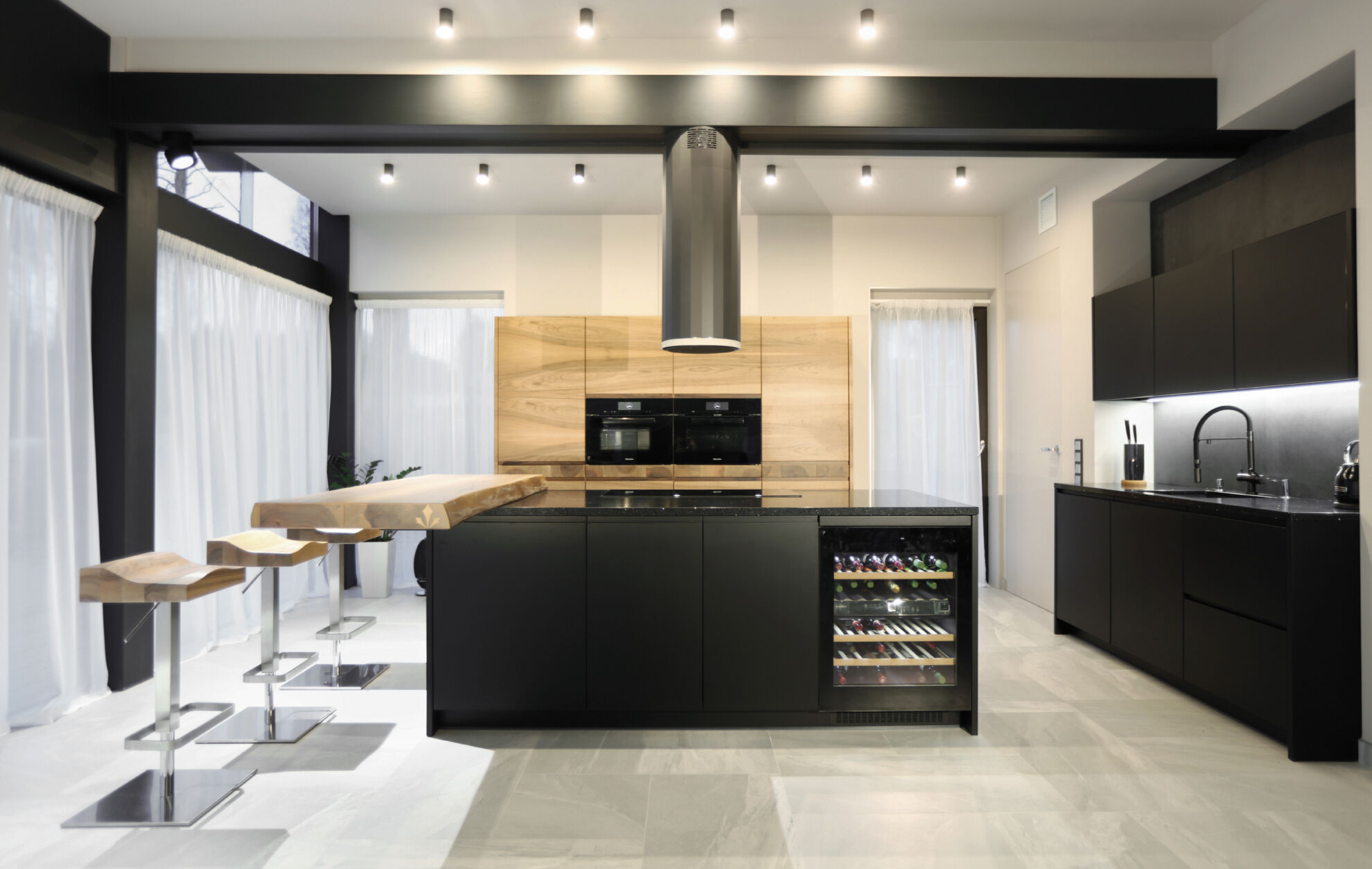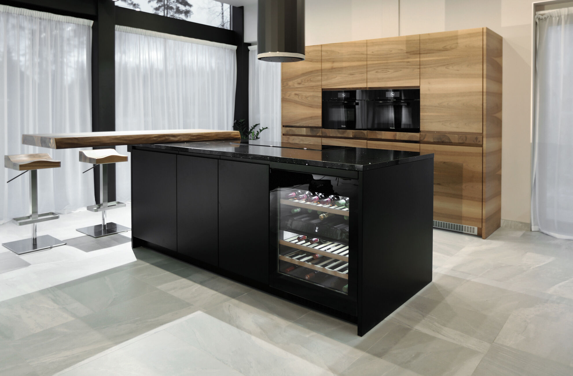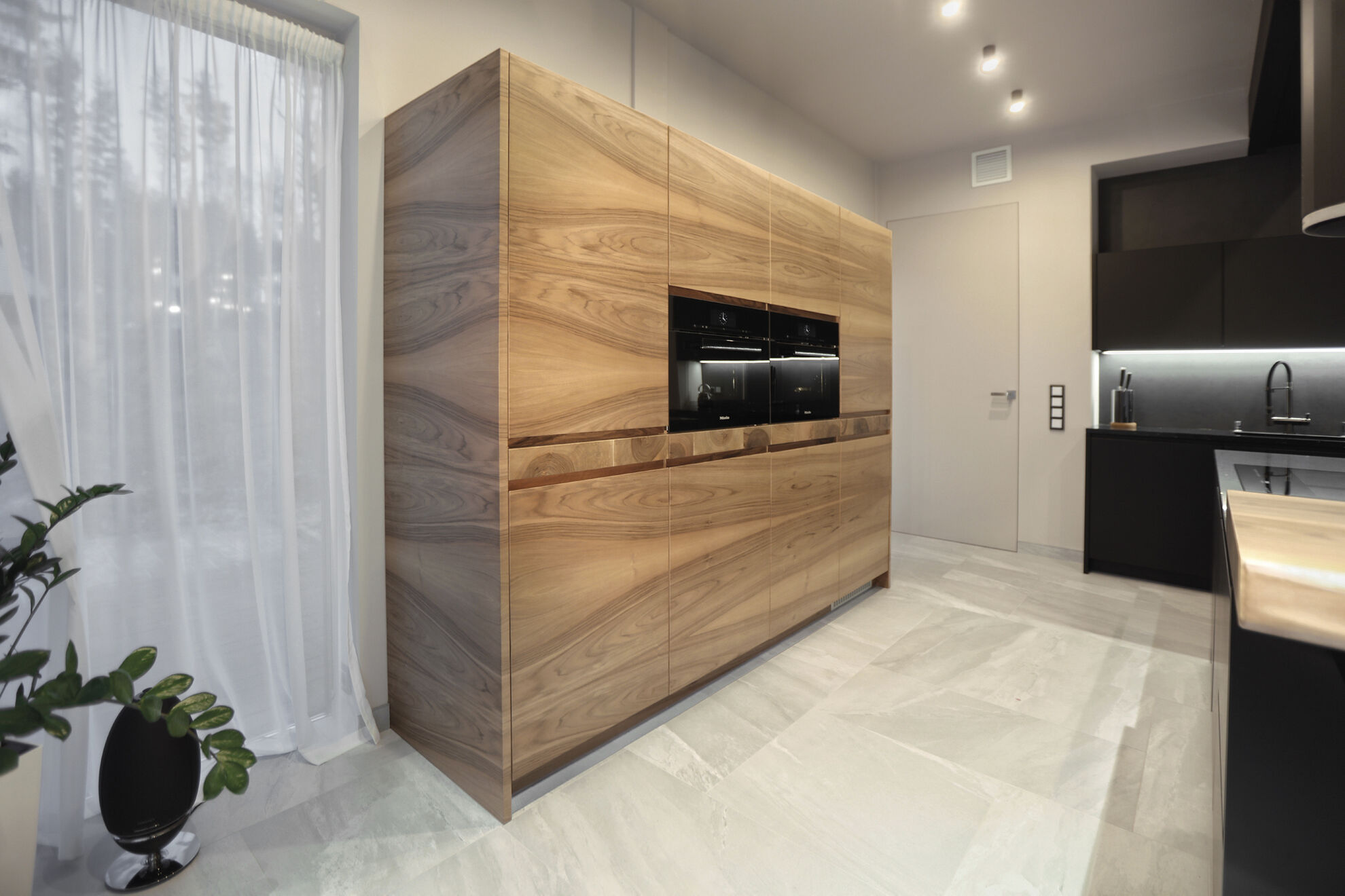 Die Küche besteht aus Hochschränken mit Fronten aus europäischem Nussbaum und maßgefertigten Griffen, die speziell für dieses Projekt entworfen und mit einem Hirnholzprofil realisiert wurden. Die Kücheninsel ist schwarz matt lackiert, ebenso wie die Unter- und Oberschränke mit integriertem Griff. Sowohl die Aufsatztheke als auch die Bar-Hocker sind in Nussbaum gefertigt wie die Hochschränke.