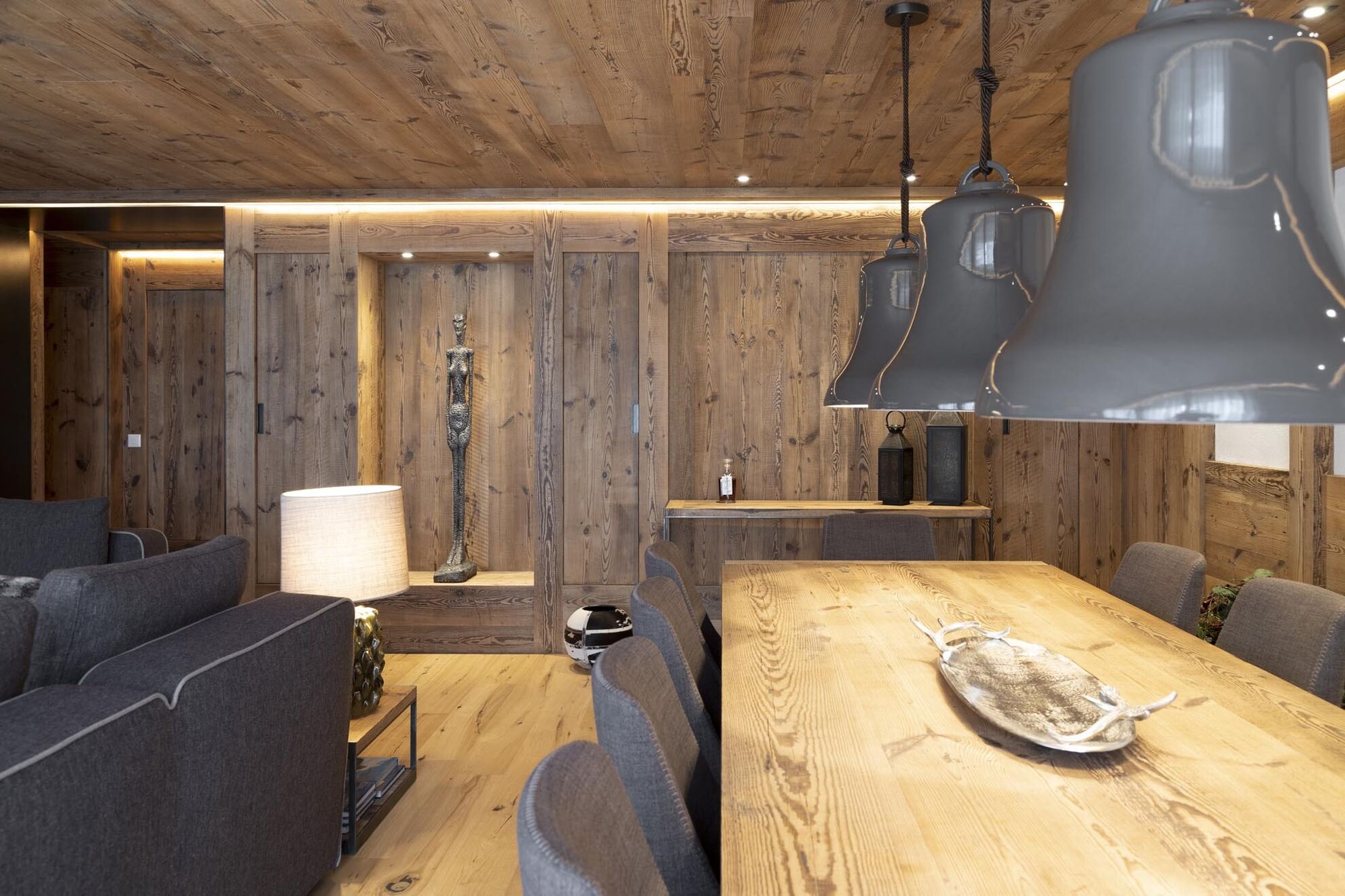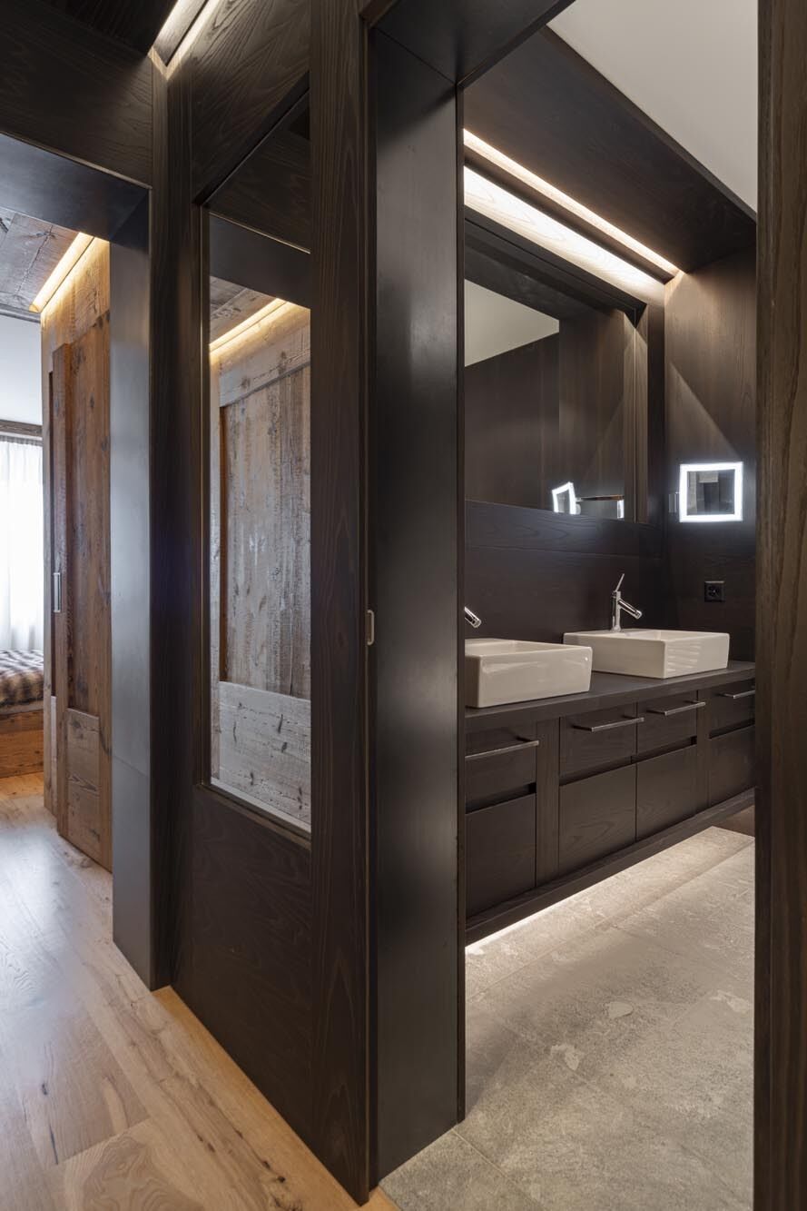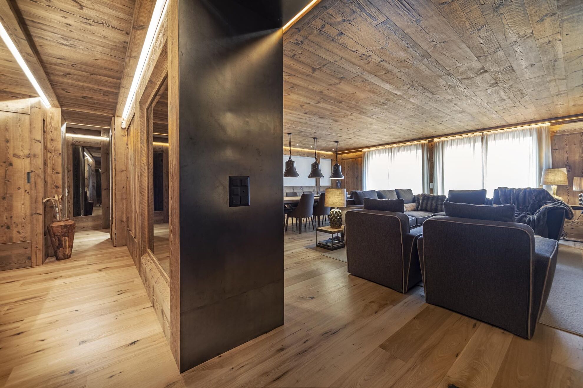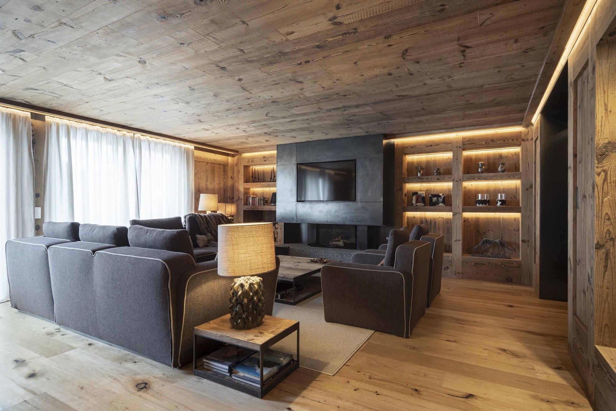The design of this apartment has been realized using an unusual combinations of natural materials such as wood, stone and patinated metal. An evocative interplay of visual and tactile contrasts. The designers wanted to recall in the spaces of the house the mineral environment of St. Moritz, softened by the snow in winter and by the green vegetation in summer. The raw materials combined with a contemporary design give the environment a delicate patina in addition to a special feeling of perpetuality resulting from this very reassuring microcosm, right in the middle of a harsh and often hostile mountain environment.
