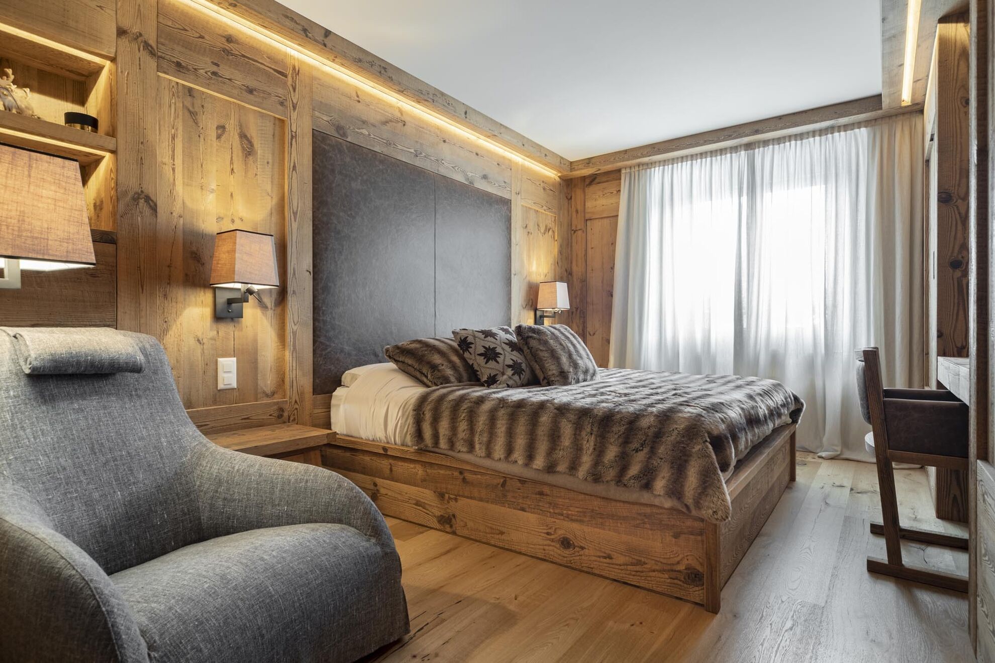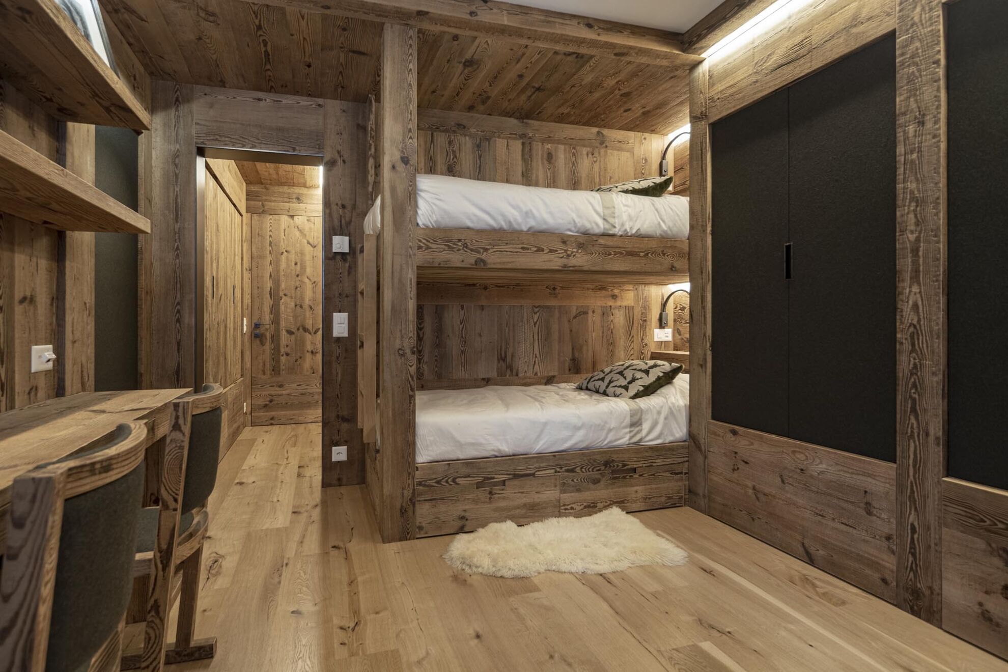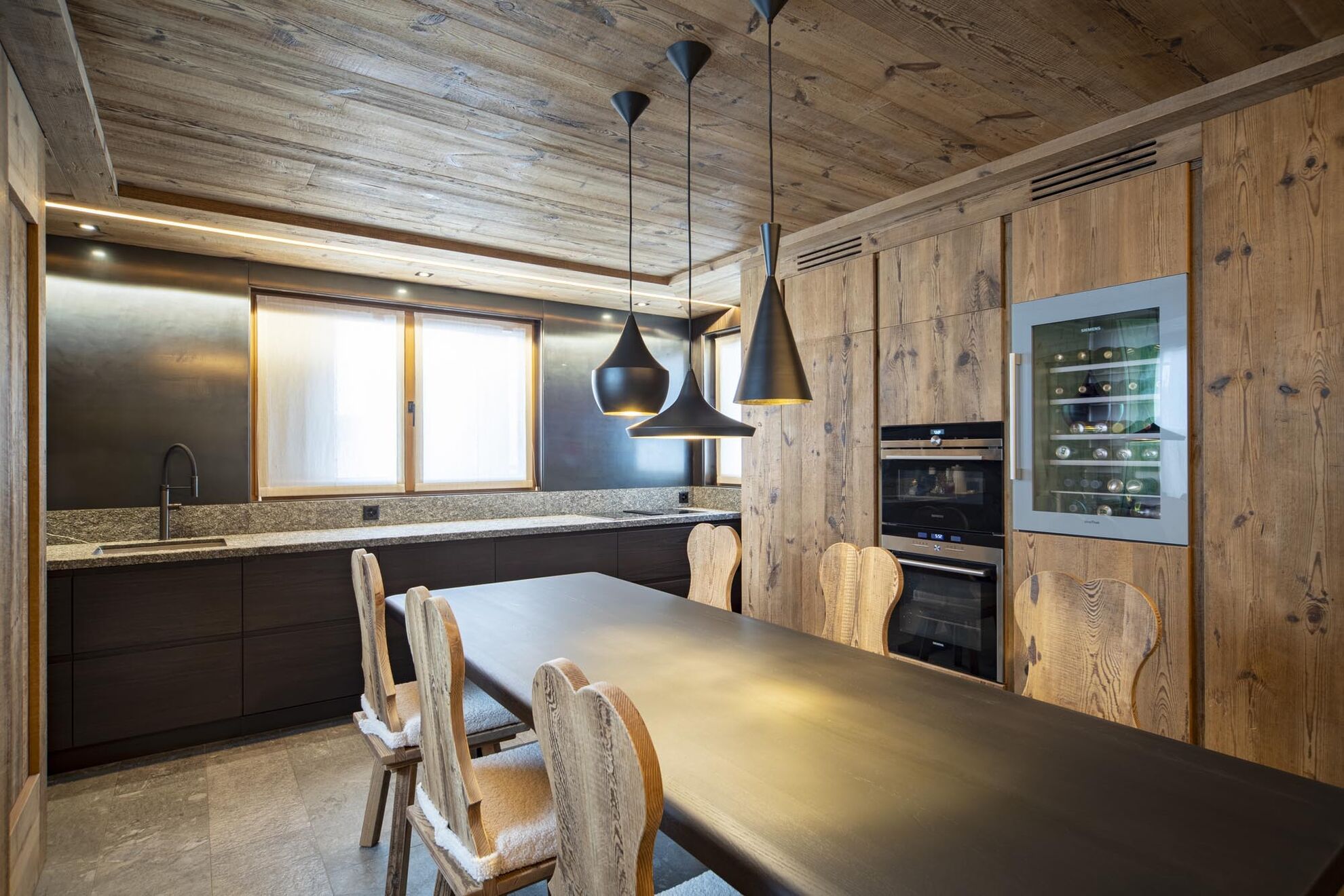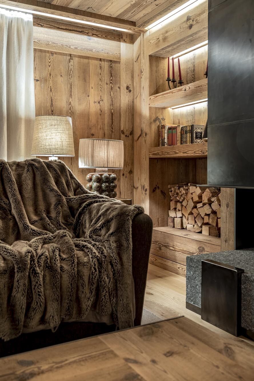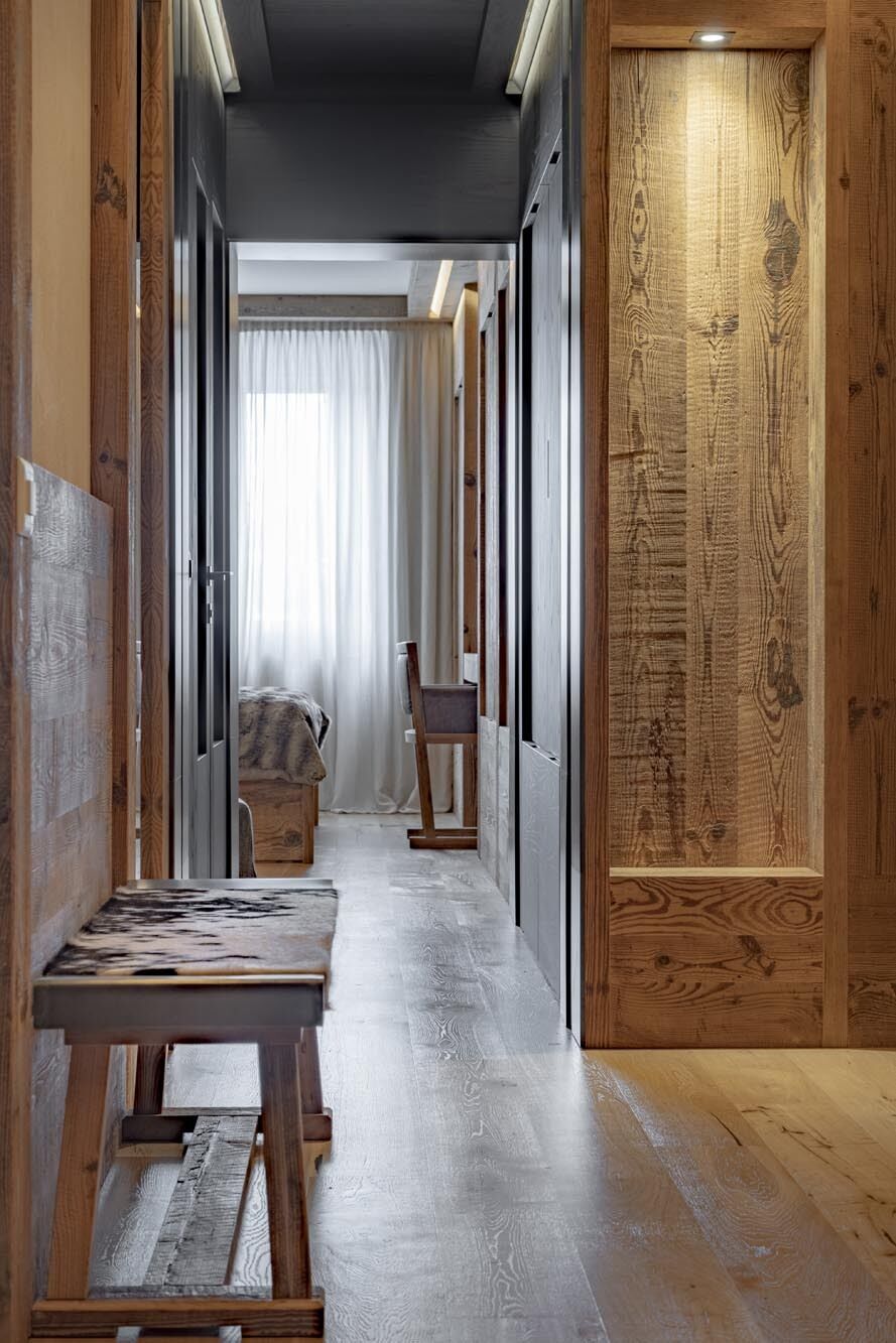 The design of this apartment has been realized using an unusual combinations of natural materials such as wood, stone and patinated metal. An evocative interplay of visual and tactile contrasts. The designers wanted to recall in the spaces of the house the mineral environment of St. Moritz, softened by the snow in winter and by the green vegetation in summer. The raw materials combined with a contemporary design give the environment a delicate patina in addition to a special feeling of perpetuality resulting from this very reassuring microcosm, right in the middle of a harsh and often hostile mountain environment.