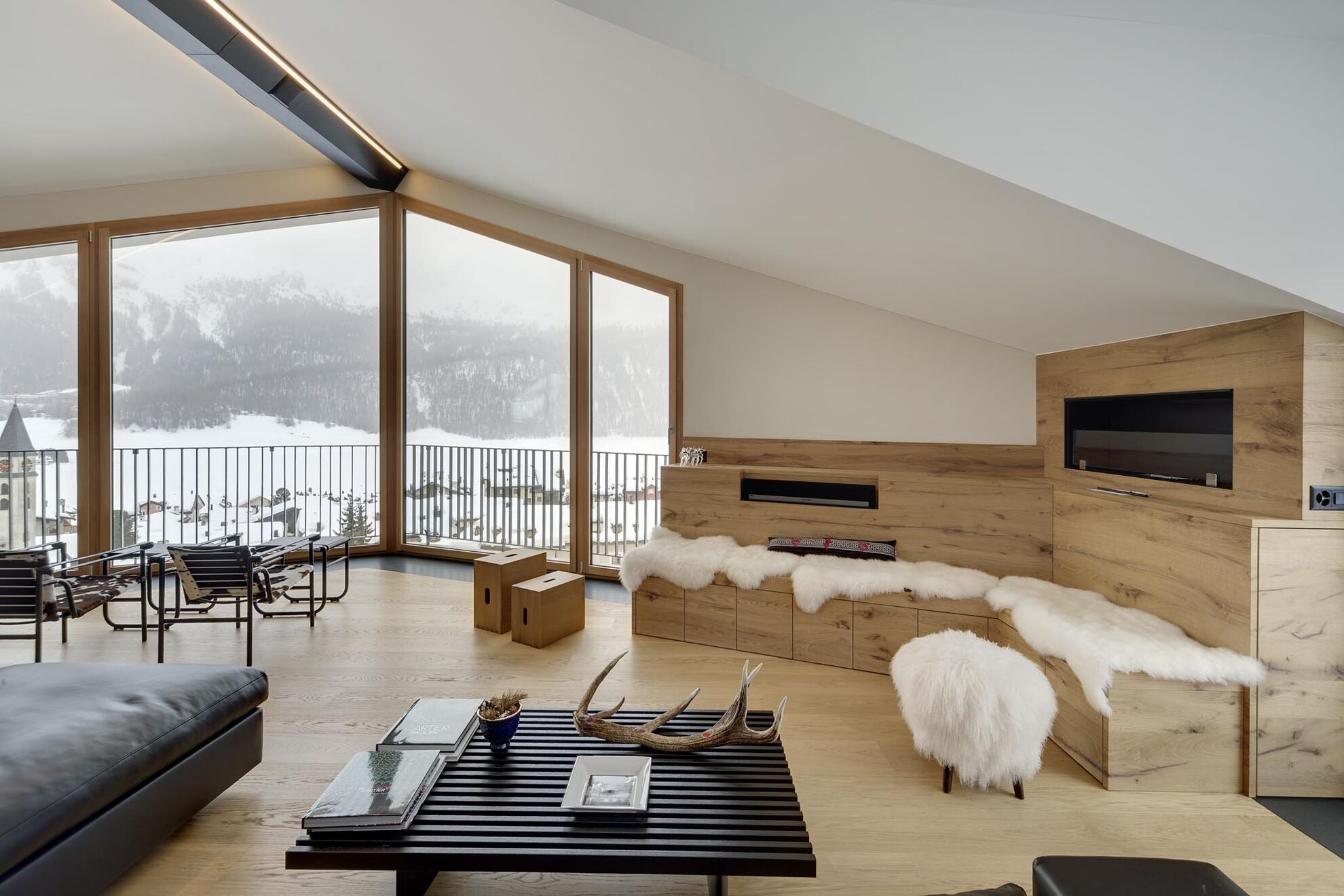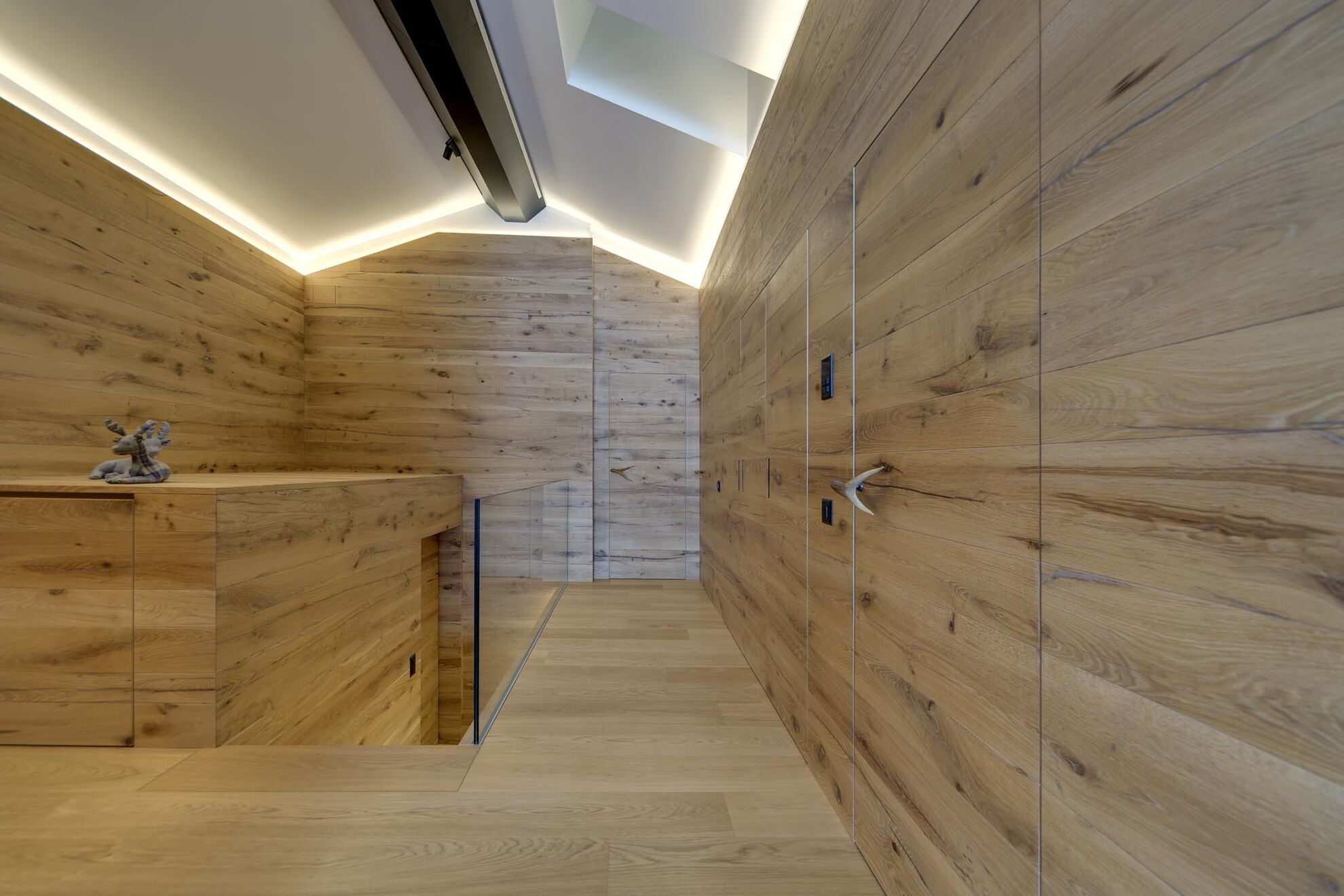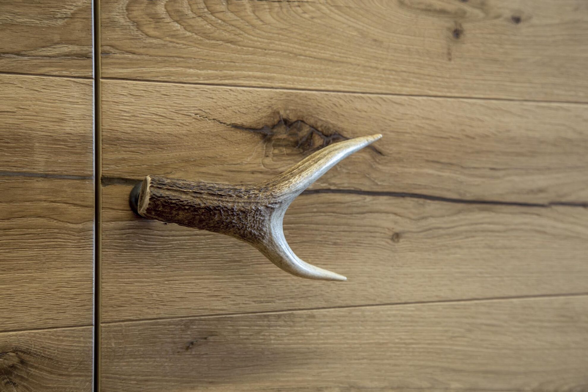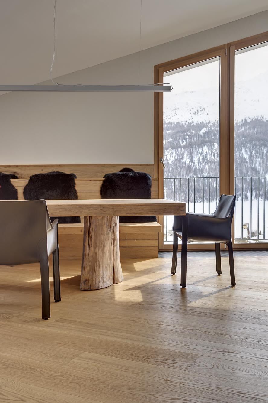 This project is dominated by an important central block that follows the inclined line of the ceiling, accompanied by an elegant profile of indirect lighting. The furniture is made entirely of reclaimed oak with particular attention to detail, such as the special recessed handles and the ones made of deer horn. These design choices recall the Engadin mountain tradition, like the base of the dining table made by a section of tree trunk. Elements that contrast with other ones of more modern design. Concerning color, the wood is in contrast with the predominant black color of the furniture, especially in the kitchen where there are black lacquered elements along with the floor of the same color.
