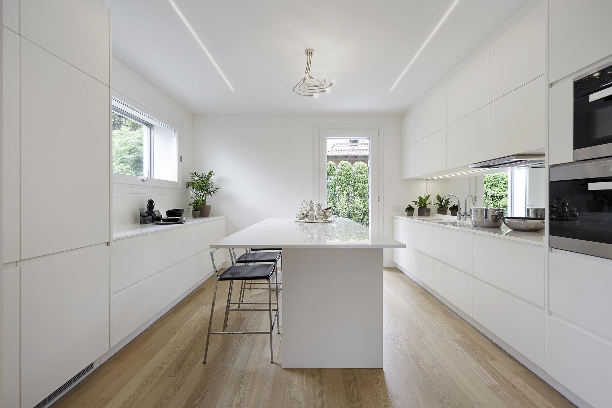 The furniture shown in this project has been designed and manufactured in close collaboration between Del Curto and the customer. White is the dominant color. The complete furniture and the kitchen are white lacquered and they both seem to disappear within the environment. The glossy kitchen counter top gives a sense of lightness and makes everything seem ethereal. The design is modern, essential, simple and characterized by clean lines. The spaces are furnished with soft-colored units and with wall paneling with a frame in matt white color as well.
