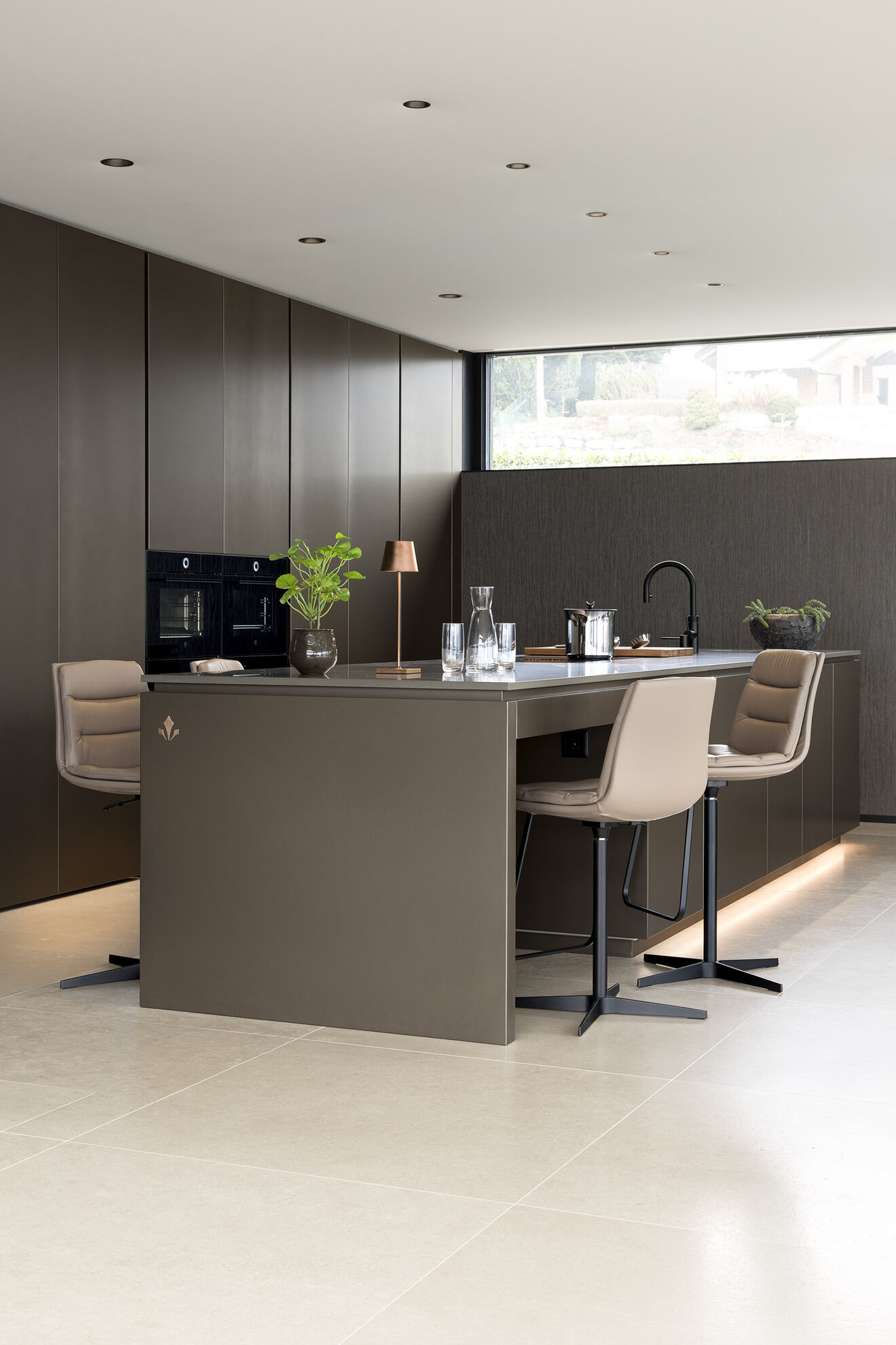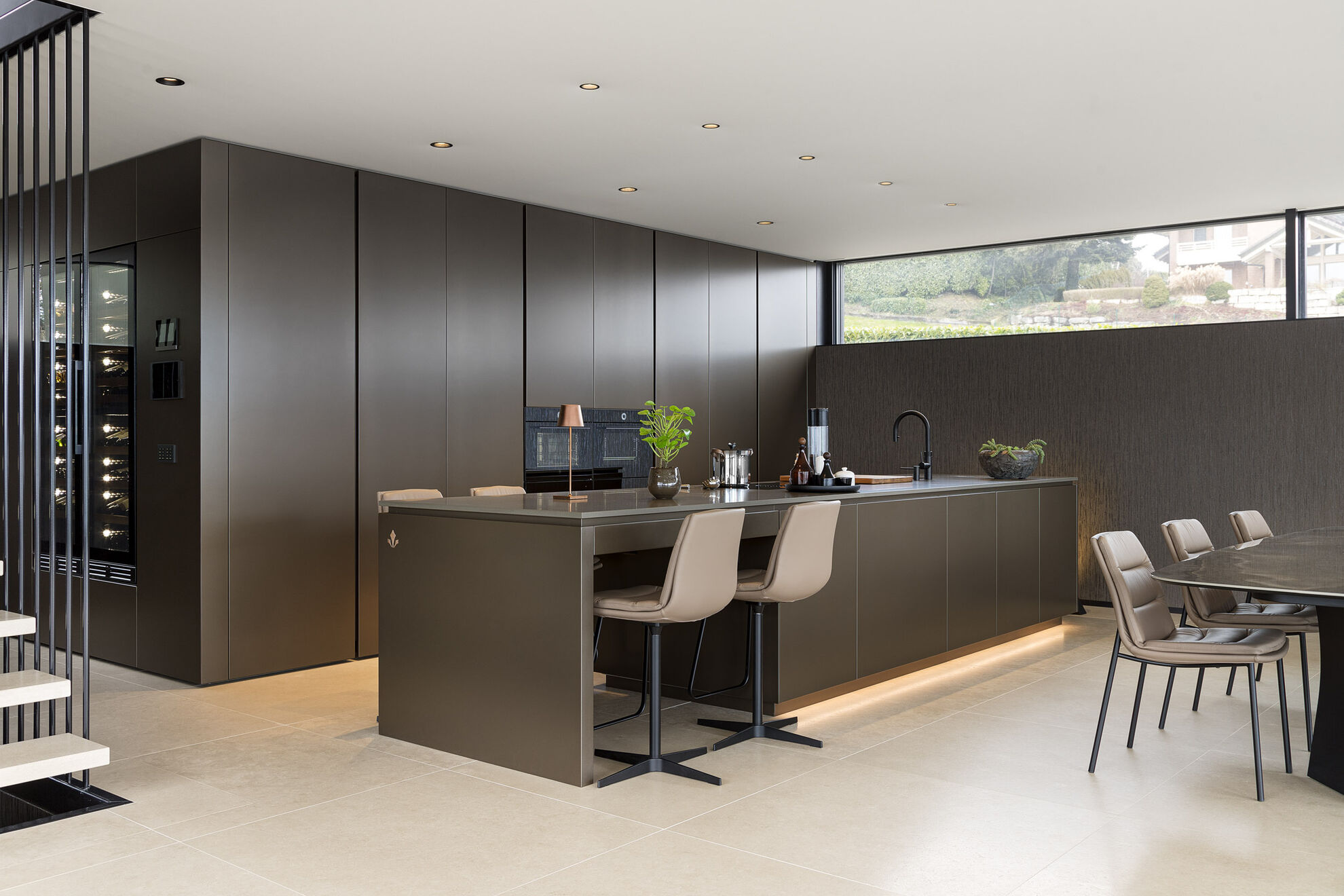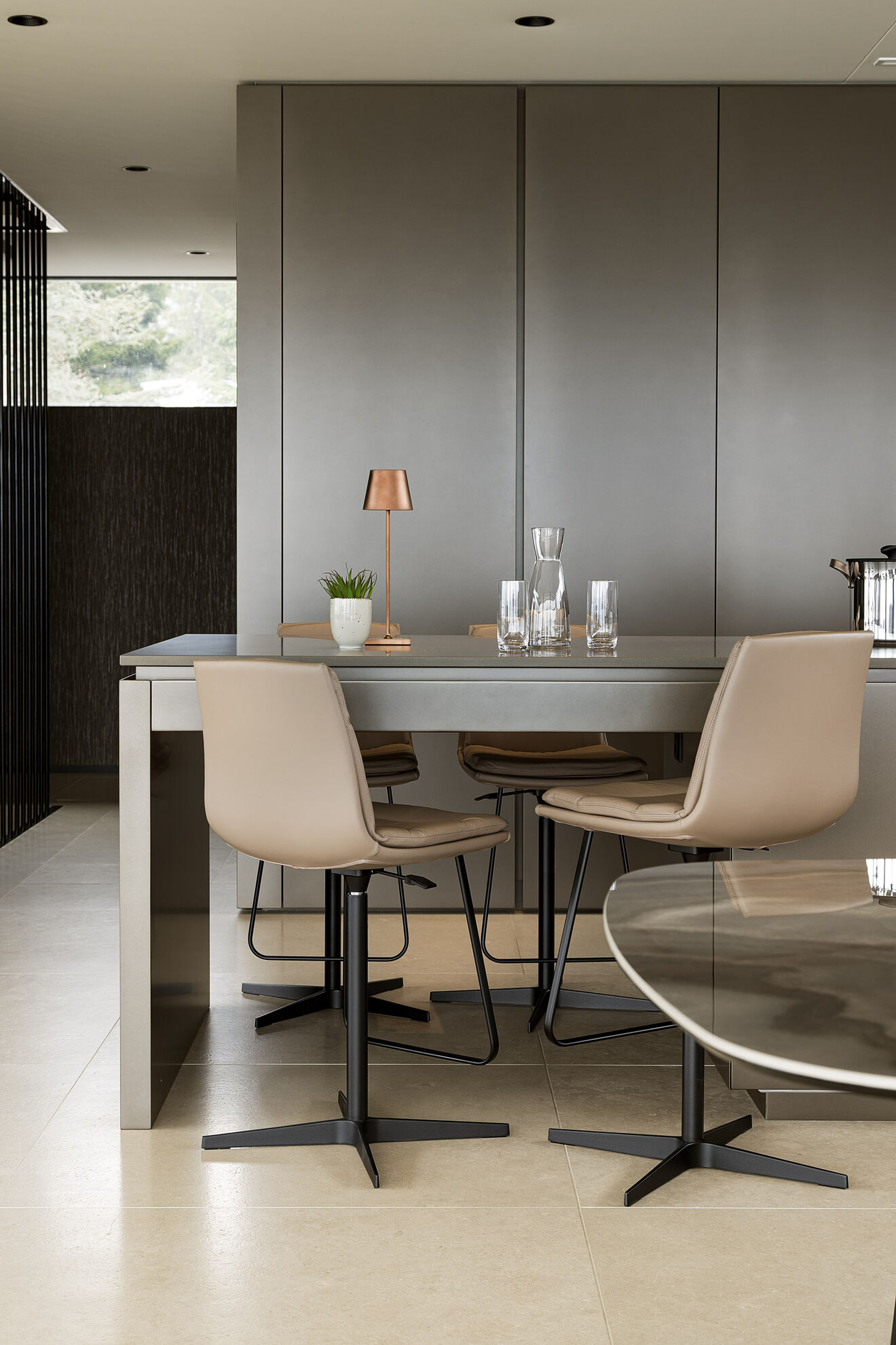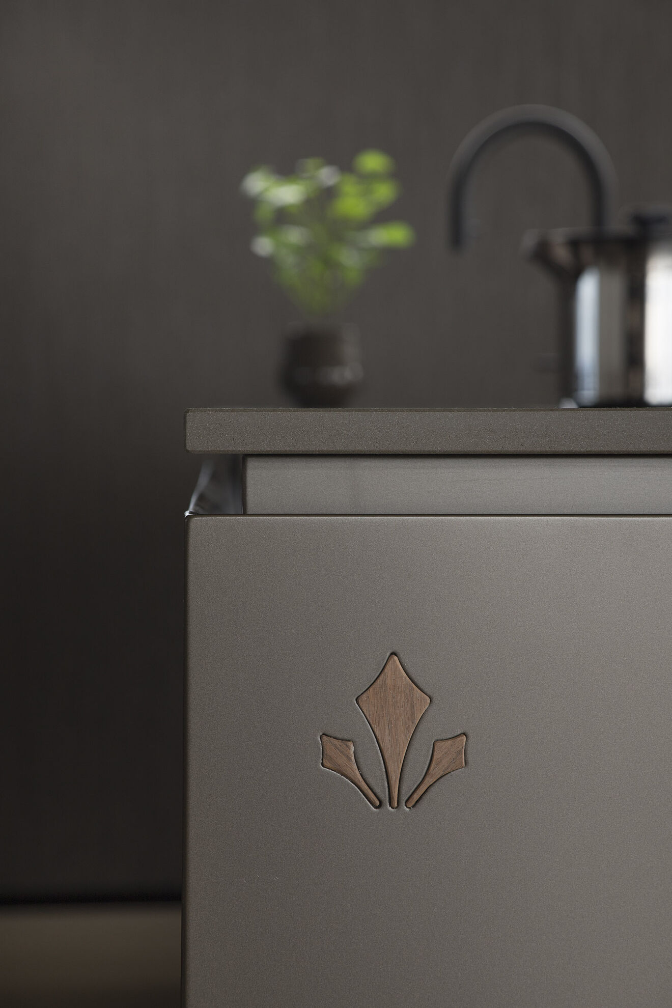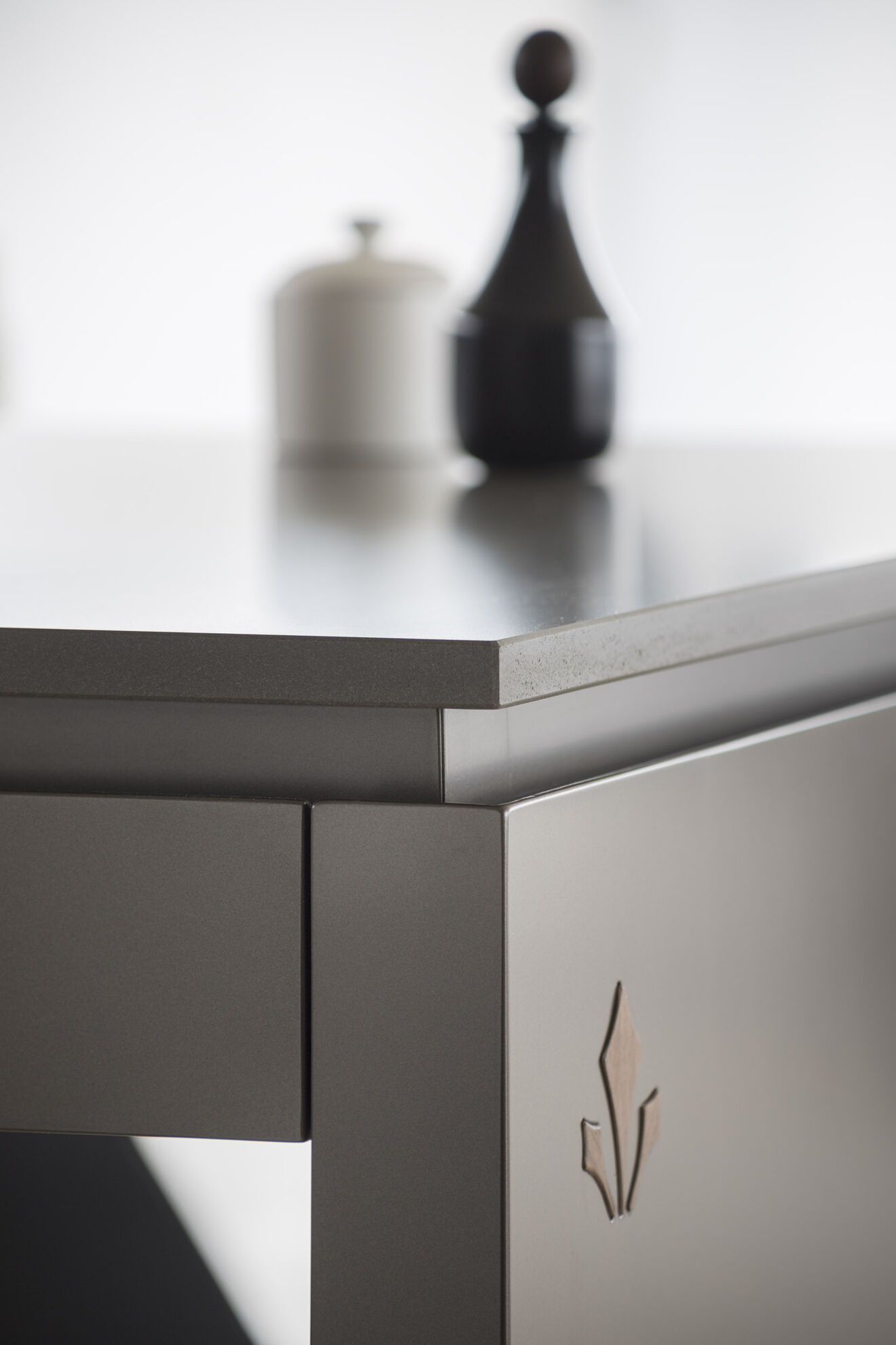 Un progetto dal forte impatto visivo, la cucina C12 è interamente laccata effetto metallo, con colonne che inglobano il blocco ascensore e un’isola con tavolo snack in perfetta armonia estetica. L’uso di materiali innovativi e finiture di pregio sottolinea la ricerca di soluzioni d’arredo moderne e funzionali, in cui il dettaglio diventa protagonista.