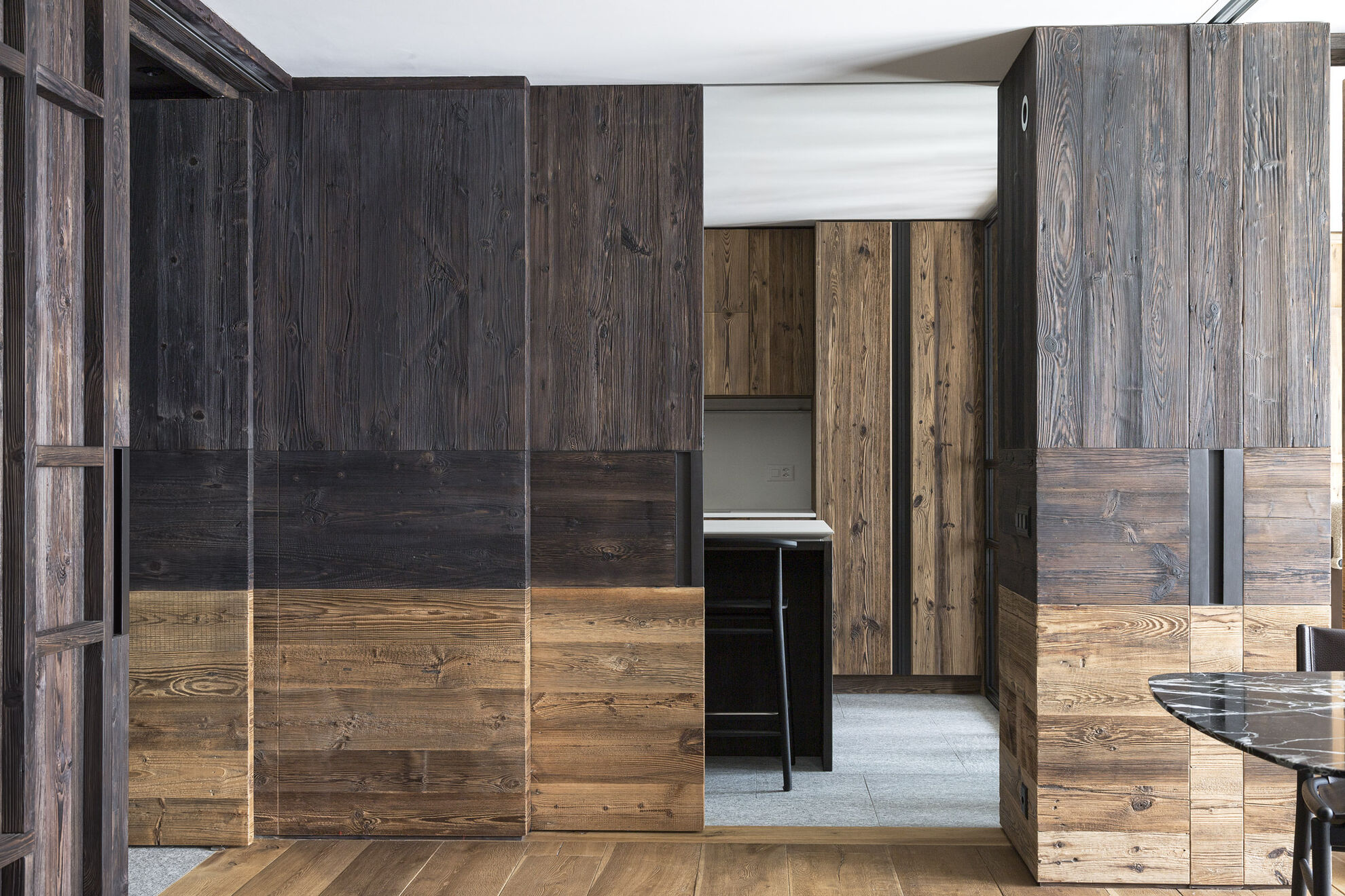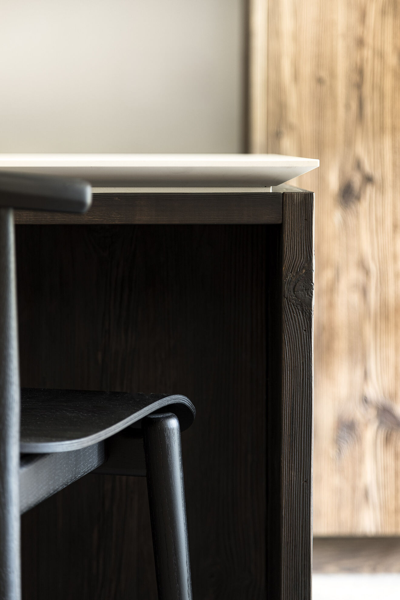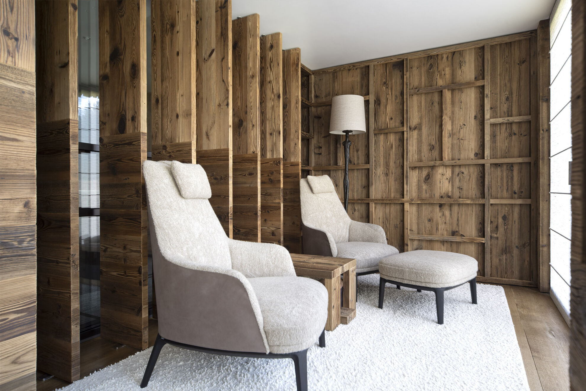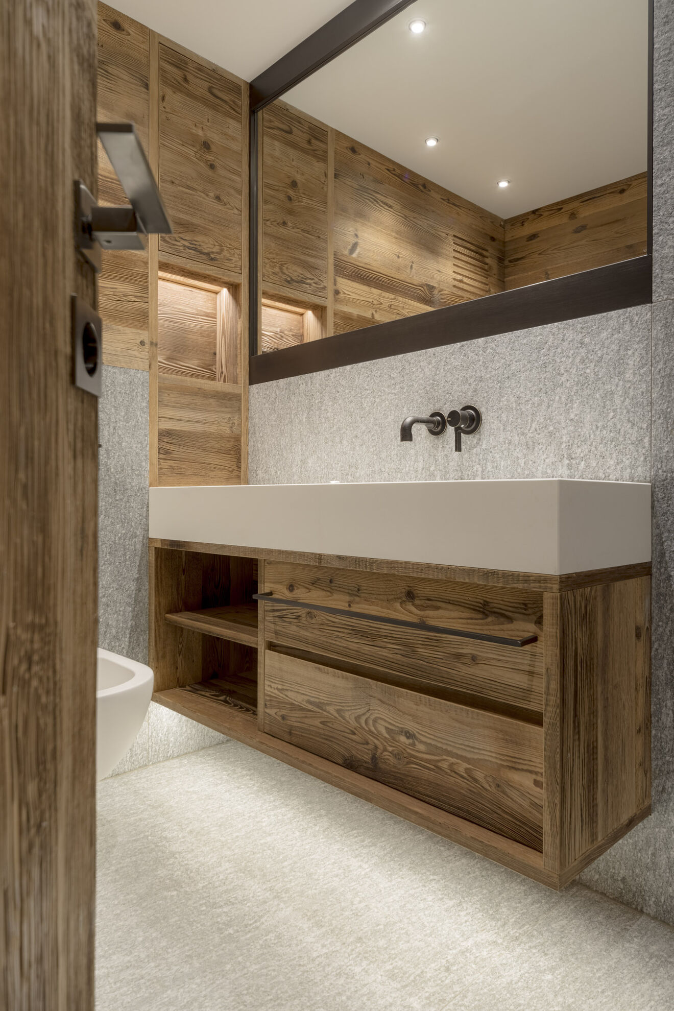 Realizzato in collaborazione con lo Studio di Architettura Fanetti and Partners, questo progetto esalta il connubio tra legno vecchio e legno bruciato, creando un raffinato gioco di venature e contrasti. L’uso di elementi metallici, insieme a dettagli come bordature e cornici, dà vita a uno spazio dal fascino autentico, perfettamente inserito nel contesto engadinese. Ogni ambiente riflette l’attenzione per il design d’interni, con soluzioni su misura che valorizzano la materia prima e l’estetica montana.